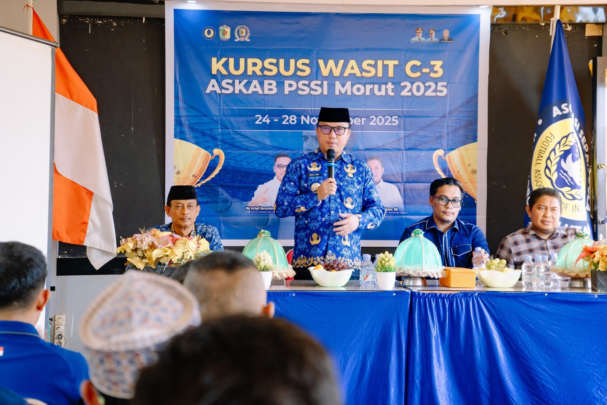 Kolonodale- Bupati Morowali Utara, Dr. dr. Delis Julkarson Hehi, MARS, secara resmi menutup kegiatan Kursus Wasit C-3 yang diselenggarakan ASKAB PSSI Morowali Utara, Jumat (28/11/2025). Pelatihan ini telah berlangsung sejak 24 November 2025 sebagai upaya meningkatkan kualitas perangkat pertandingan serta memperkuat pembinaan sepak bola di Kabupaten Morowali Utara.