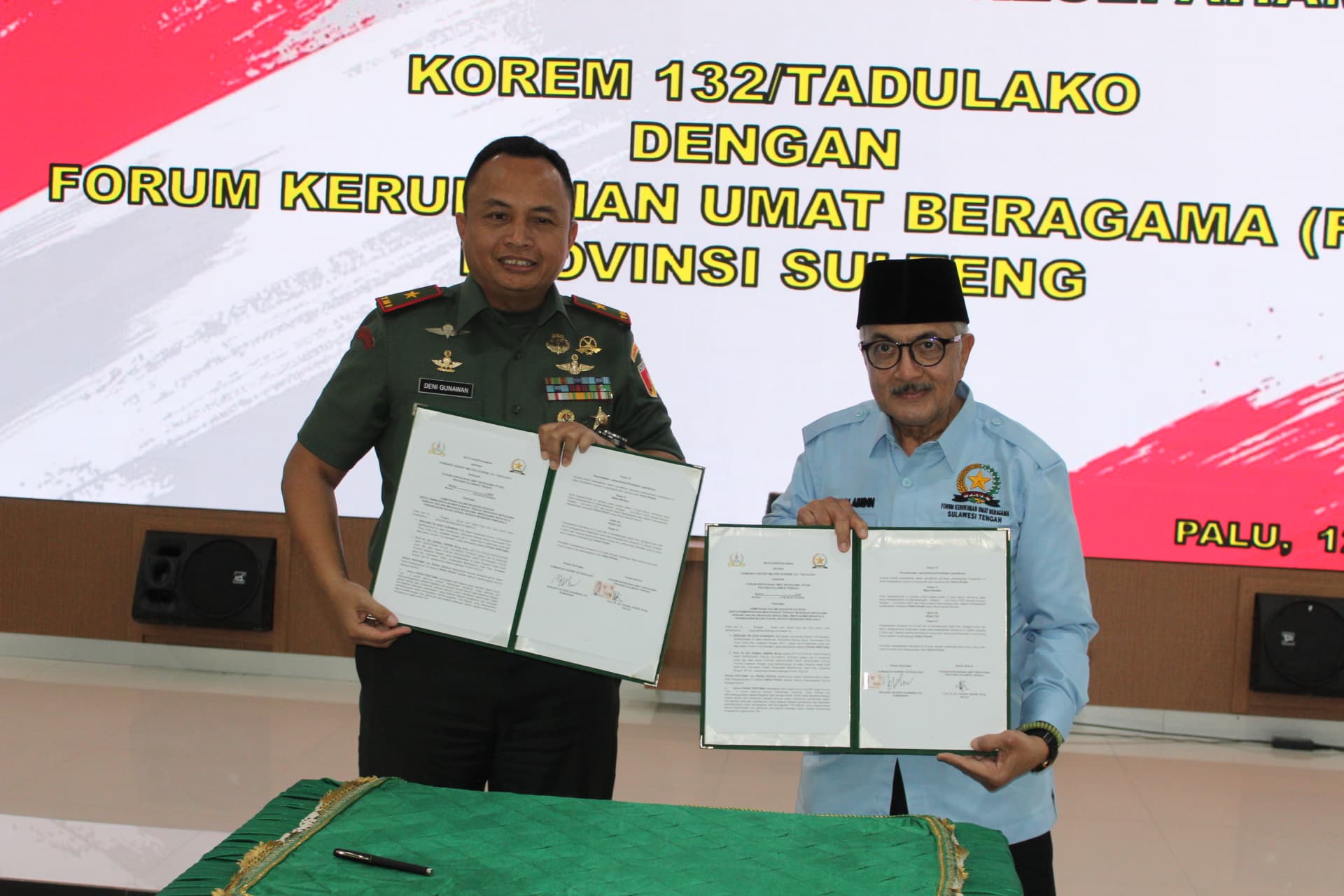 Kerja sama itu dituangkan dalam nota kesepahaman antara Ketua FKUB Sulawesi Tengah Prof Zainal Abidin dan Komandan Korem 132/Tadulako Brigjen TNI Deni Gunawan di Palu, Kamis (12/6/2025).